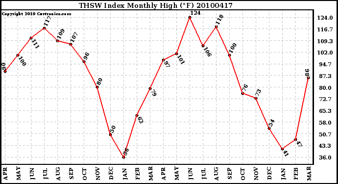 Milwaukee Weather -- 20100417 THSW Index Monthly High (°F) -- From curtronics.com by Curt Blank