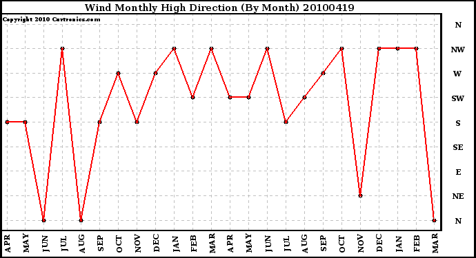 Milwaukee Weather -- 20100419 Wind Monthly High Direction (By Month) -- From curtronics.com by Curt Blank