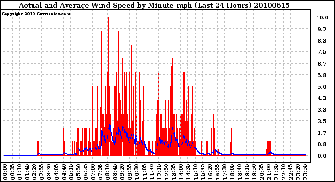 Milwaukee Weather -- 20100615 Actual and Average Wind Speed by Minute mph (Last 24 Hours) -- From curtronics.com by Curt Blank
