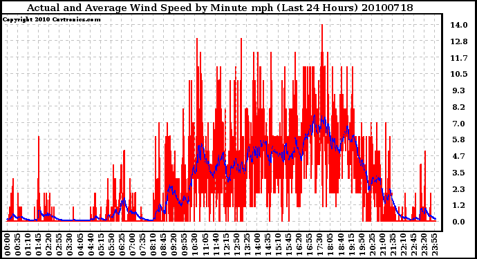 Milwaukee Weather -- 20100718 Actual and Average Wind Speed by Minute mph (Last 24 Hours) -- From curtronics.com by Curt Blank