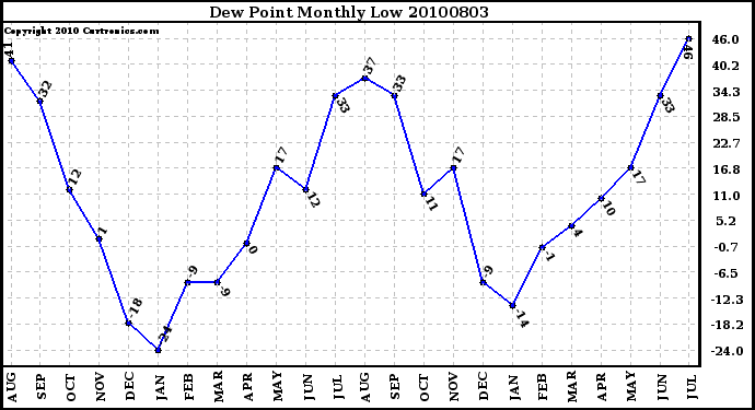 Milwaukee Weather -- 20100803 Dew Point Monthly Low -- From curtronics.com by Curt Blank