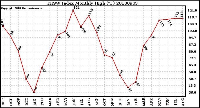 Milwaukee Weather -- 20100903 THSW Index Monthly High (°F) -- From curtronics.com by Curt Blank