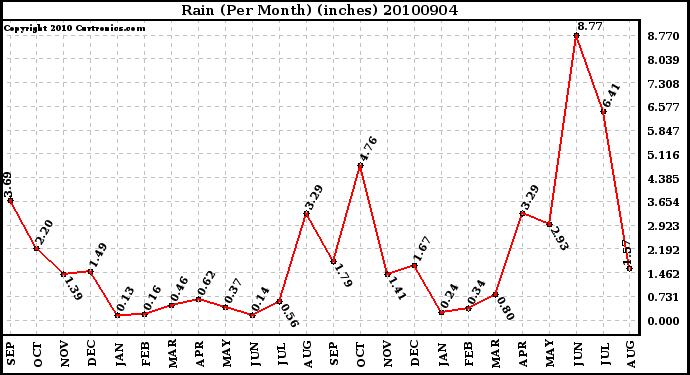 Milwaukee Weather -- 20100904 Rain (Per Month) (inches) -- From curtronics.com by Curt Blank