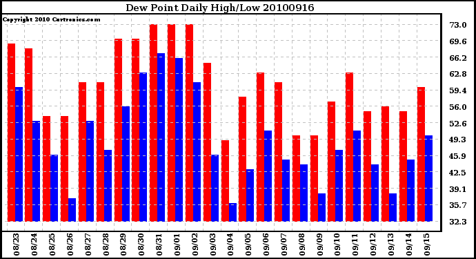 Milwaukee Weather -- 20100916 Dew Point Daily High/Low -- From curtronics.com by Curt Blank