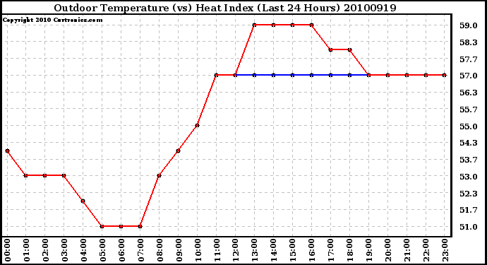 Milwaukee Weather -- 20100919 Outdoor Temperature (vs) Heat Index (Last 24 Hours) -- From curtronics.com by Curt Blank