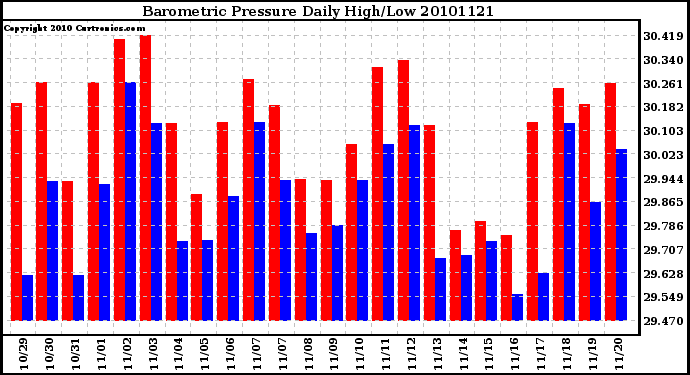 Milwaukee Weather -- 20101121 Barometric Pressure Daily High/Low -- From curtronics.com by Curt Blank