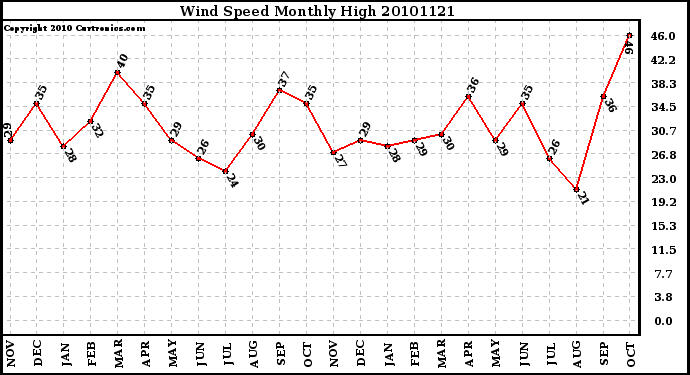 Milwaukee Weather -- 20101121 Wind Speed Monthly High -- From curtronics.com by Curt Blank