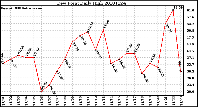 Milwaukee Weather -- 20101124 Dew Point Daily High -- From curtronics.com by Curt Blank