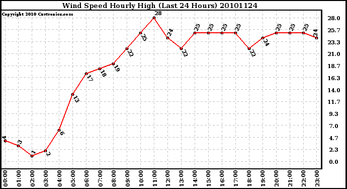 20101124 Wind Speed Hourly High (Last 24 Hours)