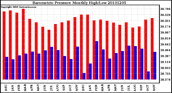 Milwaukee Weather -- 20101205 Barometric Pressure Monthly High/Low -- From curtronics.com by Curt Blank
