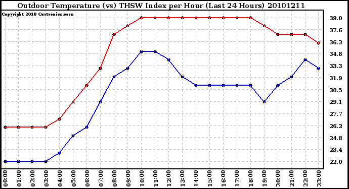 Milwaukee Weather -- 20101211 Outdoor Temperature (vs) THSW Index per Hour (Last 24 Hours) -- From curtronics.com by Curt Blank
