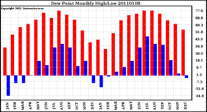 Milwaukee Weather -- 20110108 Dew Point Monthly High/Low -- From curtronics.com by Curt Blank