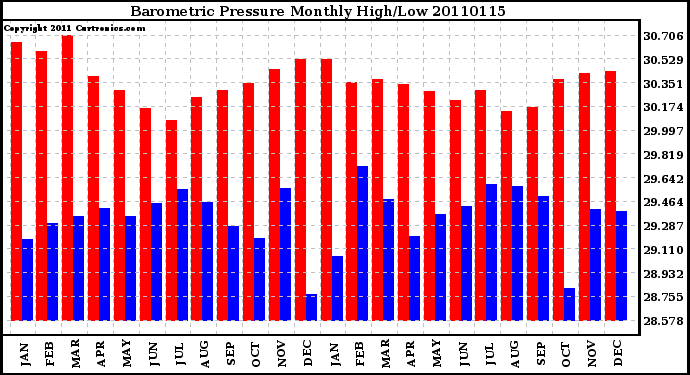 Milwaukee Weather -- 20110115 Barometric Pressure Monthly High/Low -- From curtronics.com by Curt Blank