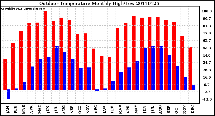 Milwaukee Weather -- 20110125 Outdoor Temperature Monthly High/Low -- From curtronics.com by Curt Blank