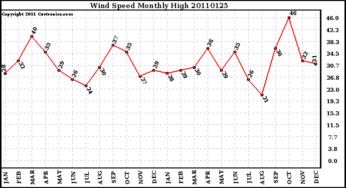 Milwaukee Weather -- 20110125 Wind Speed Monthly High -- From curtronics.com by Curt Blank