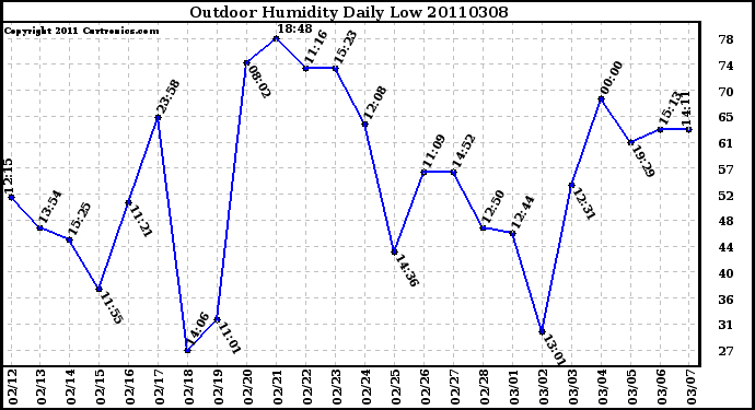 Milwaukee Weather -- 20110308 Outdoor Humidity Daily Low -- From curtronics.com by Curt Blank