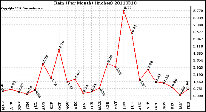 Milwaukee Weather -- 20110310 Rain (Per Month) (inches) -- From curtronics.com by Curt Blank