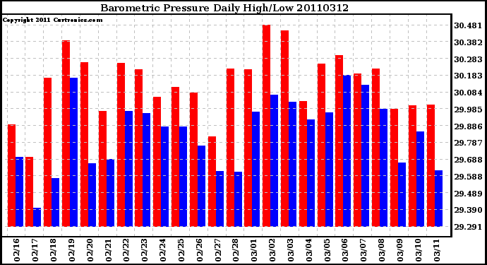 Milwaukee Weather -- 20110312 Barometric Pressure Daily High/Low -- From curtronics.com by Curt Blank