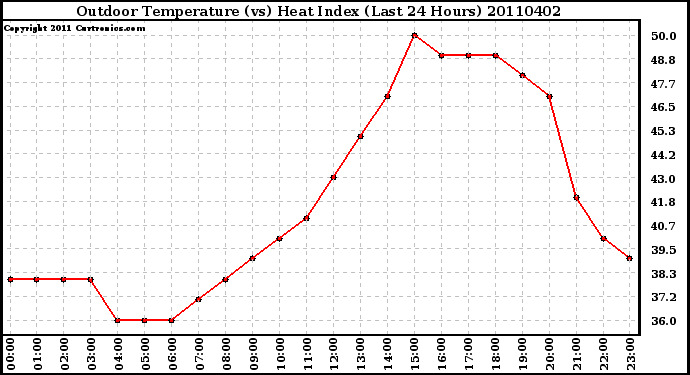 Milwaukee Weather -- 20110402 Outdoor Temperature (vs) Heat Index (Last 24 Hours) -- From curtronics.com by Curt Blank