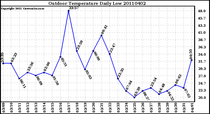 Milwaukee Weather -- 20110402 Outdoor Temperature Daily Low -- From curtronics.com by Curt Blank