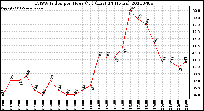 Milwaukee Weather -- 20110408 THSW Index per Hour (°F) (Last 24 Hours) -- From curtronics.com by Curt Blank