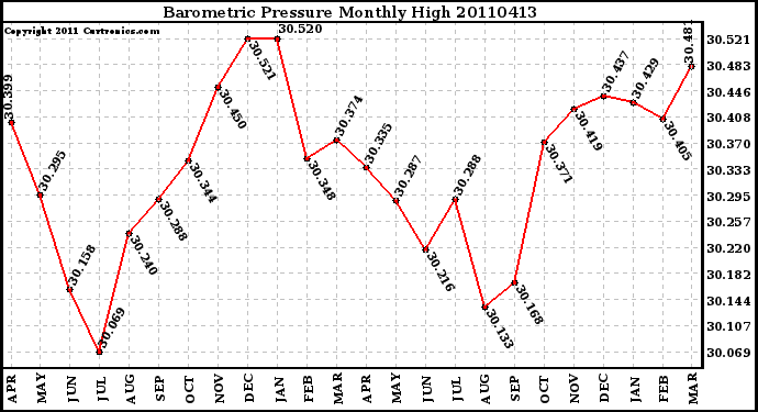 Milwaukee Weather -- 20110413 Barometric Pressure Monthly High -- From curtronics.com by Curt Blank