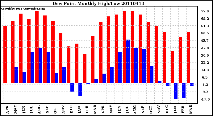 Milwaukee Weather -- 20110413 Dew Point Monthly High/Low -- From curtronics.com by Curt Blank