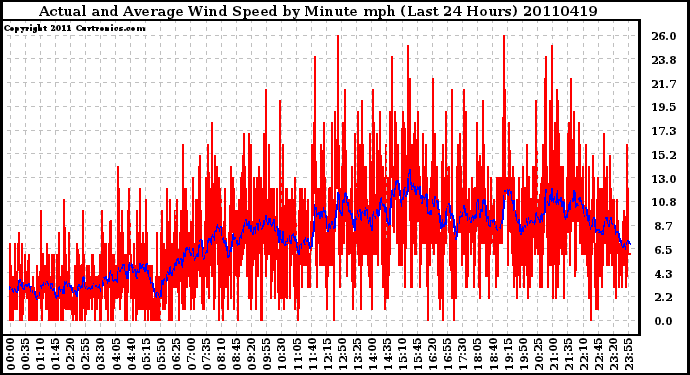 Milwaukee Weather -- 20110419 Actual and Average Wind Speed by Minute mph (Last 24 Hours) -- From curtronics.com by Curt Blank