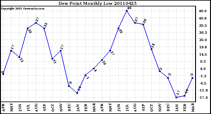 Milwaukee Weather -- 20110425 Dew Point Monthly Low -- From curtronics.com by Curt Blank