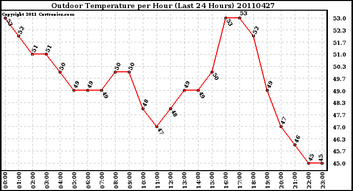Milwaukee Weather -- 20110427 Outdoor Temperature per Hour (Last 24 Hours) -- From curtronics.com by Curt Blank