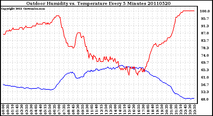 Milwaukee Weather -- 20110520 Outdoor Humidity vs. Temperature Every 5 Minutes -- From curtronics.com by Curt Blank