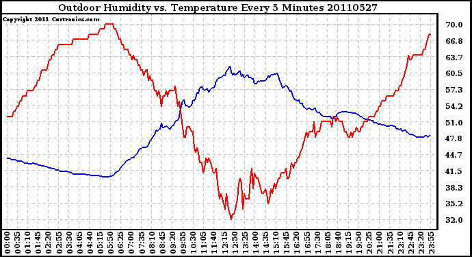Milwaukee Weather -- 20110527 Outdoor Humidity vs. Temperature Every 5 Minutes -- From curtronics.com by Curt Blank