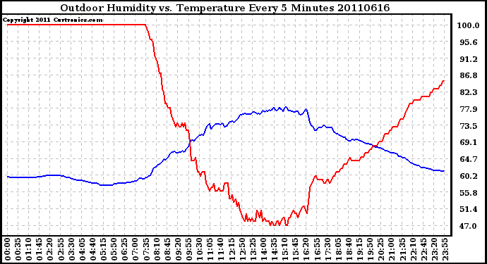 Milwaukee Weather -- 20110616 Outdoor Humidity vs. Temperature Every 5 Minutes -- From curtronics.com by Curt Blank