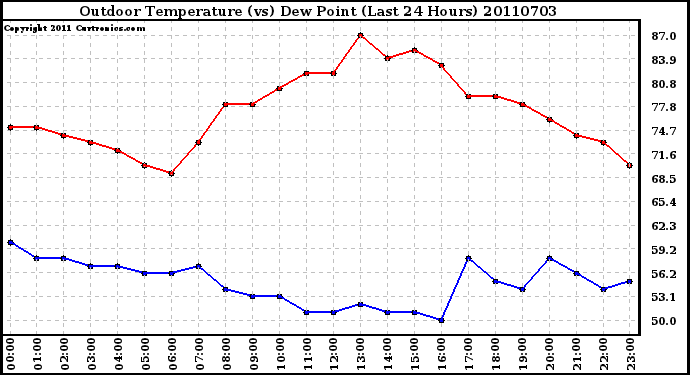 Milwaukee Weather -- 20110703 Outdoor Temperature (vs) Dew Point (Last 24 Hours) -- From curtronics.com by Curt Blank