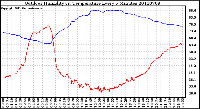 Milwaukee Weather -- 20110709 Outdoor Humidity vs. Temperature Every 5 Minutes -- From curtronics.com by Curt Blank