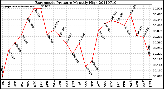 Milwaukee Weather -- 20110710 Barometric Pressure Monthly High -- From curtronics.com by Curt Blank
