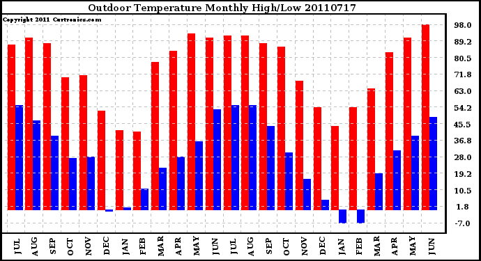 Milwaukee Weather -- 20110717 Outdoor Temperature Monthly High/Low -- From curtronics.com by Curt Blank