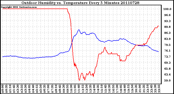 Milwaukee Weather -- 20110728 Outdoor Humidity vs. Temperature Every 5 Minutes -- From curtronics.com by Curt Blank