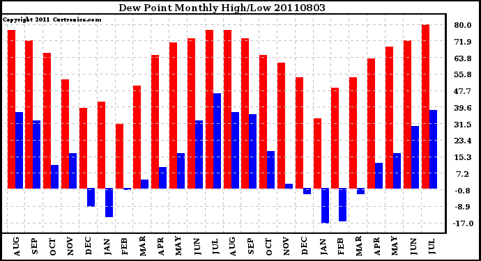 Milwaukee Weather -- 20110803 Dew Point Monthly High/Low -- From curtronics.com by Curt Blank