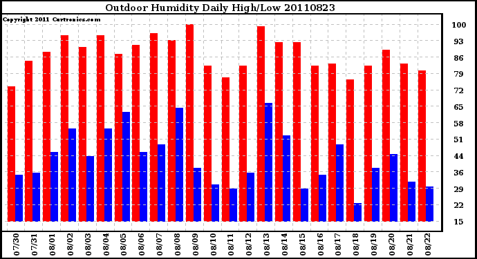 Milwaukee Weather -- 20110823 Outdoor Humidity Daily High/Low -- From curtronics.com by Curt Blank