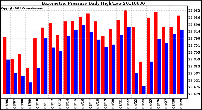 Milwaukee Weather -- 20110830 Barometric Pressure Daily High/Low -- From curtronics.com by Curt Blank