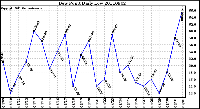 Milwaukee Weather -- 20110902 Dew Point Daily Low -- From curtronics.com by Curt Blank