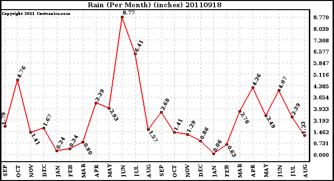 Milwaukee Weather -- 20110918 Rain (Per Month) (inches) -- From curtronics.com by Curt Blank