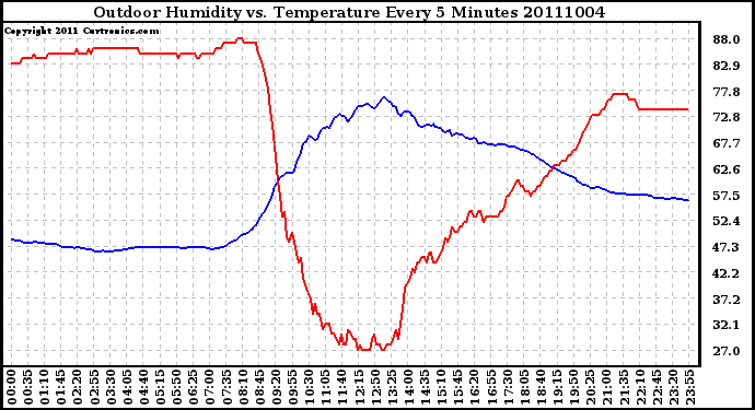 Milwaukee Weather -- 20111004 Outdoor Humidity vs. Temperature Every 5 Minutes -- From curtronics.com by Curt Blank