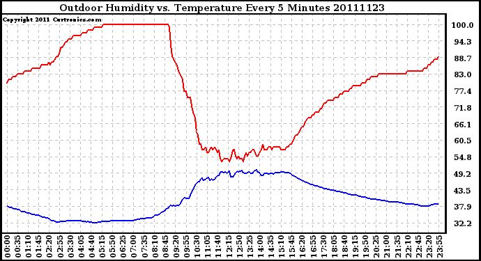 Milwaukee Weather -- 20111123 Outdoor Humidity vs. Temperature Every 5 Minutes -- From curtronics.com by Curt Blank