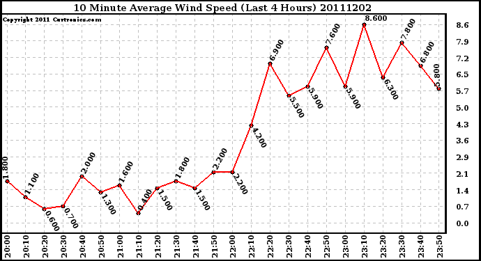 20111202 10 Minute Average Wind Speed (Last 4 Hours)