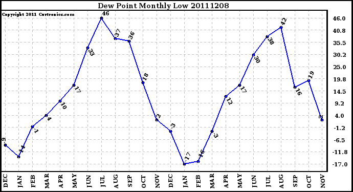 Milwaukee Weather -- 20111208 Dew Point Monthly Low -- From curtronics.com by Curt Blank