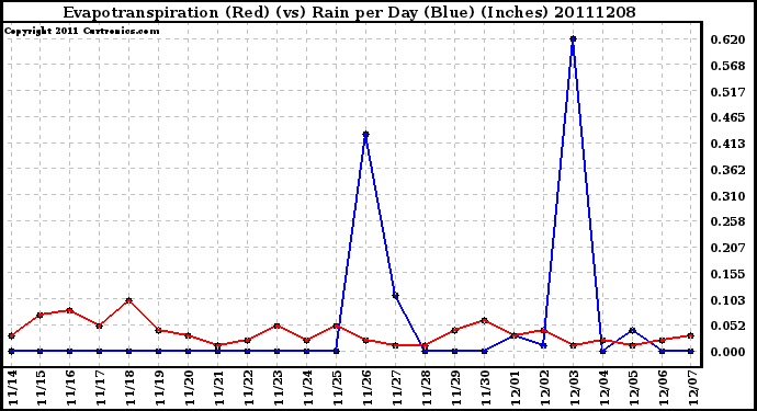 20111208 Evapotranspiration (Red) (vs) Rain per Day (Blue) (Inches)