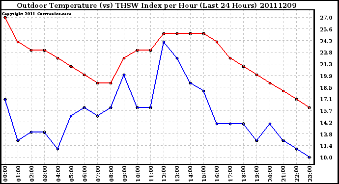 Milwaukee Weather -- 20111209 Outdoor Temperature (vs) THSW Index per Hour (Last 24 Hours) -- From curtronics.com by Curt Blank
