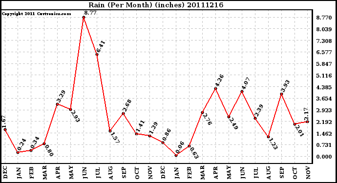 Milwaukee Weather -- 20111216 Rain (Per Month) (inches) -- From curtronics.com by Curt Blank